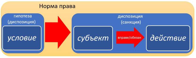 Использование специально-юридических познаний можно показать на примере анализа охранительной нормы. Норма права образуется благодаря установлению связи между формально определенными обстоятельствами (первый элемент нормы) и формально определенными последствиями (второй элемент нормы). Первый элемент охранительной нормы традиционно называется диспозицией, второй - санкцией. Диспозиция, в свою очередь, образуется благодаря связи между субъектом ("деятелем") и тем действием, которое он вправе или обязан совершить.