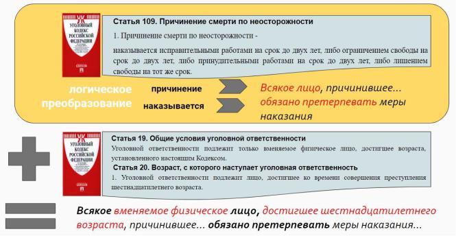 выражена количественная сторона нормы. В связи с этим, на первом этапе толкования необходимо осуществить логическое преобразование, в результате которого интерпретатор может на основе повествовательного предложения, содержащегося в тексте закона сконструировать нормативное предложение: всякое лицо, причинившее смерть по неосторожности, обязано... (смотри Логический способ толкования)