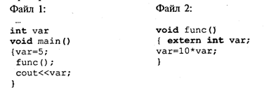 Тут обмін значеннями між основною і допоміжною функцією func() відбувається через загальну глобальну змінну var, для якої під час компіляції виділяється місце в зовнішньому розділі пам'яті. В результаті виконання даної програми на екран виведеться число 50.