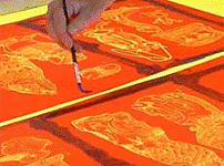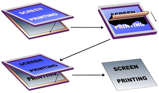 трафаретная ткань, трафареты, резиновые валики и чернила. Существует и