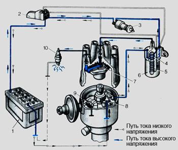 7 - распределитель, 8 - прерыватель, 9 - конденсатор, 10 - свеча зажигания
