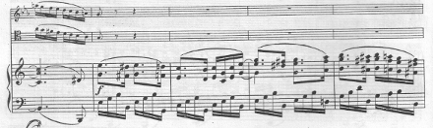 B центральном разделе разработки (т. 79-105) развиваются интонации первого элемента главной темы. Будто мерцание полутонов различных красок, света и тени воспринимаются многочисленные тональные отклонения (даже в такую далекую от a-moll тональность, как Des-dur). Хрупкость настроения достигается также приемом, довольно часто применяемым Брамсом, благодаря которому основные доли такта как бы лишаются опоры. Что касается динамики, то авторские ремарки в этом разделе достаточно ясны. Исполнителям следует лишь быть точными в их выполнении. В т. 105-115 появляется третий элемент главной темы, звучащий будто отдаленное воспоминание. Этот раздел, по существу, является предыктом к репризе.