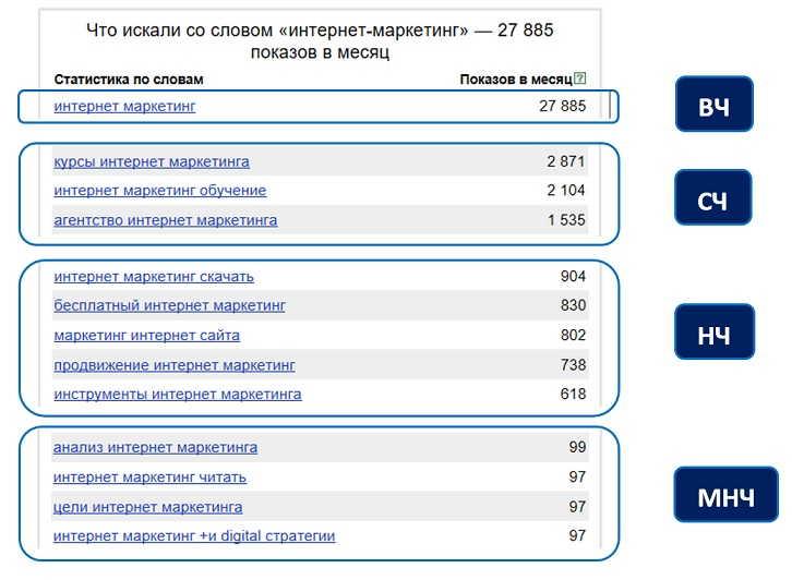 Также специалисты разделяют все запросы на 4 вида: высокочастотные , среднечастотные , низкочастотные и микронизкочастотные . Таким образом, статистику из примера выше мы можем разделить на эти четыре группы: