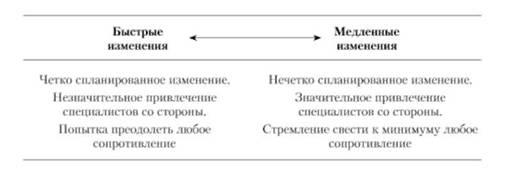 3. Выбор стратегии изменения, основанный на предшествующем анализе. Этот выбор уточняет скорость или темп изменения, объем предварительной работы, связанной с планированием, и степень вовлеченности других людей. Этот выбор определяет тактику использования различных личностей и коллективов.