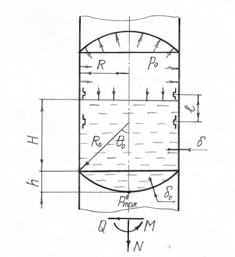 Рассмотрим цилиндрический бак. Выполним подбор основных геометрический характеристик и проведём расчёт напряжений в обечайке. Выполним расчёт этого бака на устойчивость под действием нормальных и касательных сил. Расчетная схема бака приведена на рисунке 1. Данные для расчета заключены в таблице 1.