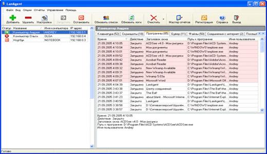 Программа для наблюдения за компьютерами в локальной сети. Выполняет следующие действия: перехватывает нажатия клавиш, запоминает запуск и закрытие программ, делает снимки экрана (скриншоты), регистрирует посещенные сайты и т.д. Программа позволит выявить деятельность, не имеющую отношения к работе, узнать, насколько рационально сотрудники используют рабочее время.