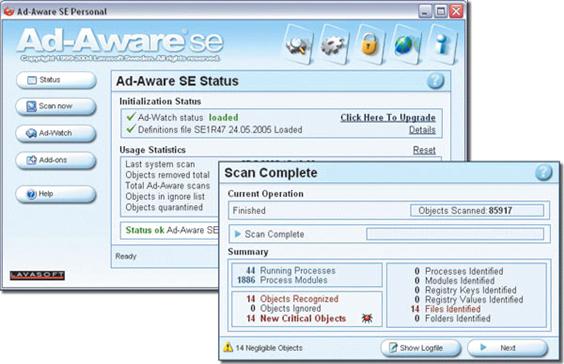 Самое популярное приложение для поиска шпионского софта Ad-Aware SE обеспечивает надежную защиту персональных данных. В нем удачно сочетаются возможности извлечения и удаления spyware-компонентов и предотвращения их установки на компьютер.