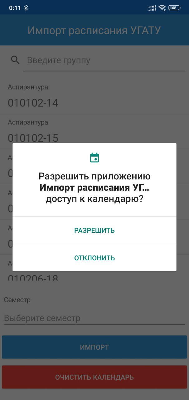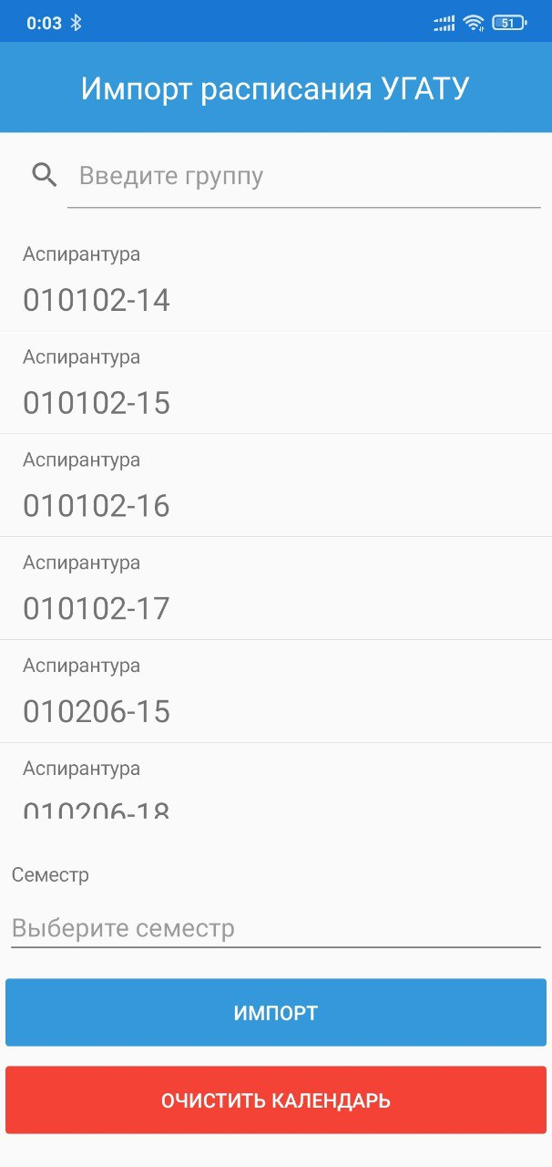 Мобильное приложение «Импорт расписания УГАТУ» − прикладное ПО, предназначенное для импорта расписания занятий в системный календарь устройства.