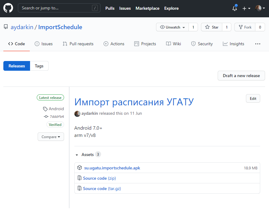Загрузите установочный пакет приложения (рисунок 3.1). Загрузить можно по ссылке – https://github.com/aydarkin/ImportSchedule/releases/.