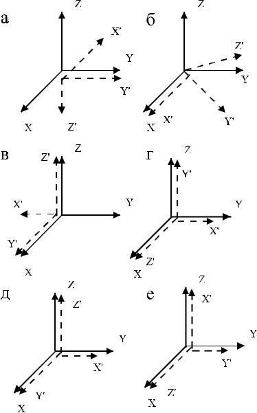 5 7. Положения координатных осей до (х у z) и после преобразования (x/ y/ z/ ) приведены на рис. 7. Ось z направлена на нас. Если ось z/ направлена на нас, то она обозначается z/, если от нас, то z.