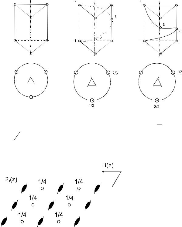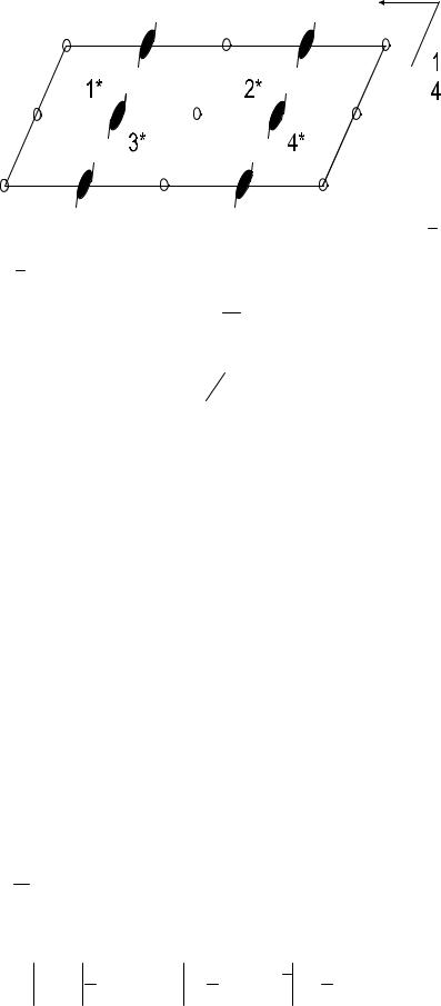 7.6 Зафиксируем произвольную точку 1 с координатами x , y , z внутри элементарной ячейки и будем действовать на нее операторами пространственной группы. Точка 2 получается из точки 1 операцией скользящего отражения в плоскости b , параллельной плоскости чертежа и поднятой на высоту c / 4 . Точка 3 получена из точки 1 поворотом вокруг винтовой оси второго порядка. Точка 4 получается из точки 1 инверсией в центре инверсии, расположенным на половине телесной диагонали элементарного параллелепипеда. Запишем координаты полученных точек.