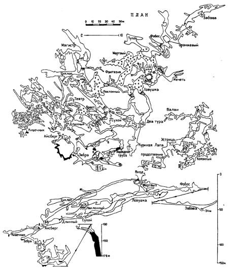 Пещера Партизанская-гр.Входной - гр.Мертвый-гр.Фантизия-гр.Наклонный-гр.Театр-гр.Айсберг-гр.Зебра-гр.Большой кальцитовый водопад-гр.Зебра-гр.Айберг-гр.Длинный - Два тура-гр.Ловушка-гр.Входной |