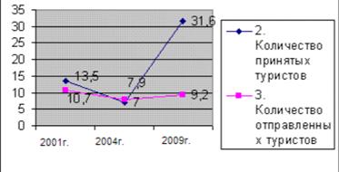 Из рис. 4 видно, что значительно возросло количество принятых туристов на территорию Псковской области, тогда как количество отправленных туристов по сравнению с 2001 годом, в 2009 году увеличилась. Гостеприимство, или сфера гостиничного и ресторанного бизнеса, является ведущим фактором и базой туризма. В Смоленской области насчитывается 39 гостиниц и гостиничных комплексов. В скором времени к смоленским гостиницам добавиться еще новый 16 этажный комплекс со всеми удобствами. На 39-ти предприятиях гостиничного типа имеется 2009 мест. В основном это одно или двухместные номера. Иностранные компании не представлены в числе собственников гостиниц, расположенных на территории смоленской области.