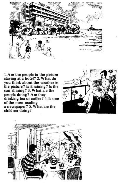 1. What a lovely weather we are having now, aren't we? 2. What are you thinking of? 3. It was the middle of the day and everyone was resting. 4. At this time two tourists were visiting the town. 5. He was still sleeping. 6. We were looking at some pictures. 7. I'm looking for my keys. 8. You are looking