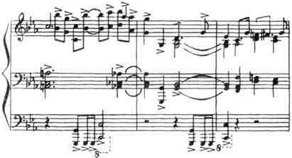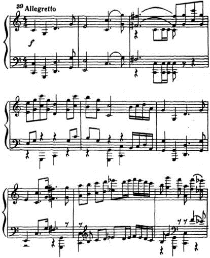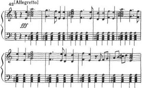 Последний «мирный» аккорд экспозиции продолжает звучать, когда издали уже доносится дробь военного барабана. На ее фоне развивается странная тема - симметричная (ходу на квинту вверх соответствует ход на кварту вниз), отрывистая, аккуратная. Словно дергаются паяцы: