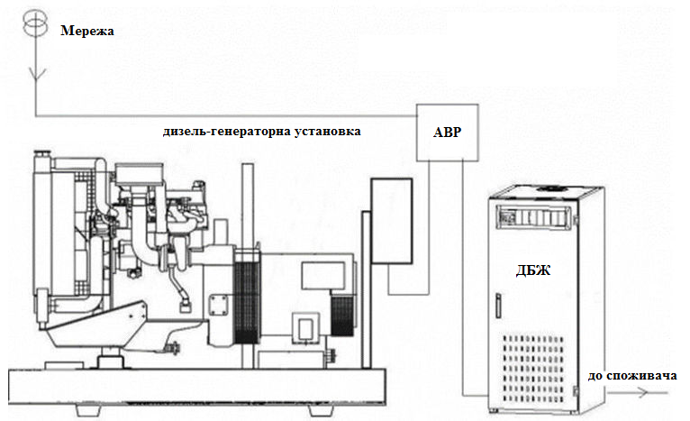 ДГУ знаходиться в режимі очікування, контролюя напругу мережі. Живлення споживача відбуваєтся через ДБЖ яке перетворює вхідну змінну напругу в постійну, заряджаючи при цьому акамулятор. При збої електроживлення контролер ДГУ запускає ДГУ. Поки ДГУ запускаєтеся ДБЖ через акамулятор створює постійну напругу. Автоматичний ввід резерва АВР перемикає навантаження на дизель-генератор. При появі зовнішньої мережі живлення все відновлюється.