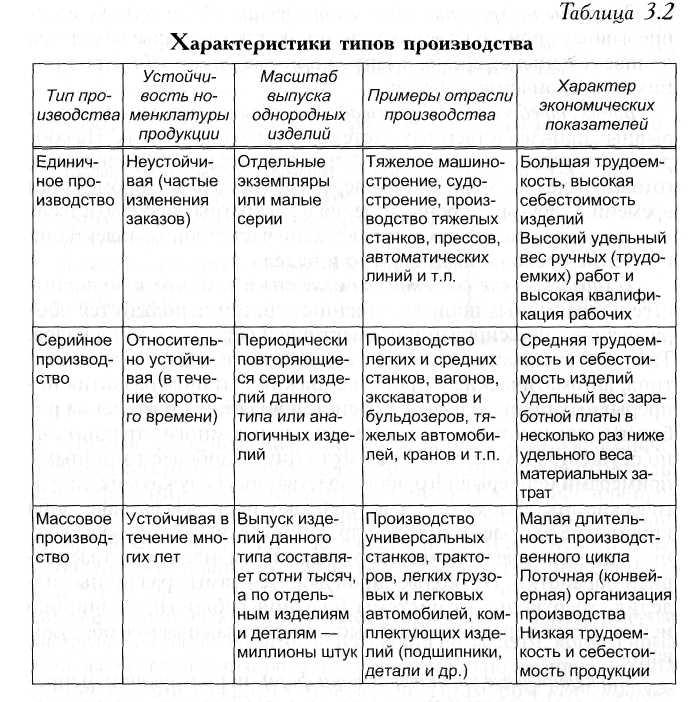 Характеристика типов производства (таблица приведена согласно [15 ].