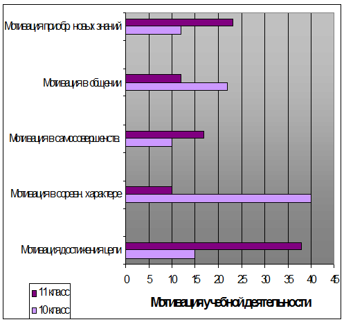 Старшеклассники 10 и 11 классов, судя по результатам исследования, имеют значительную разницу по мотивам учебной деятельности. У 10 классов важным еще является стремление завоевать авторитет среди товарищей по учебе, желание быть первым в классе сам учебный процесс отходит на второй план, на уроке хочется разговаривать, заниматься своими делами, но только не учиться. Одинадцатикласники более ориентированы на знания, их устремления направлено в будущее. Главным мотивом является подготовка к будущей профессии и к поступлению в вузы.
