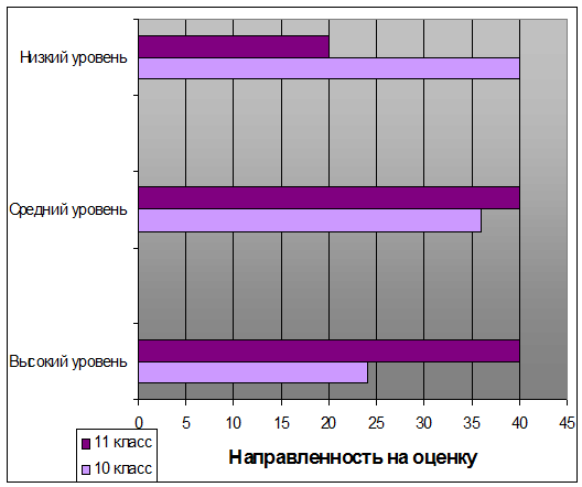 Как видно из полученных данных таблицы 3 и рисунка 3 в 10 классе преобладает низкий уровень направленности на оценку в 40%, 36% посчитали свою мотивированность к оценке как среднюю и всего 24 % как высокую. В 11 классе ситуация меняется , одинаковый процент и среднего и высокого уровня направленности на оценку но здесь лишь 19 % имеют низкую мотивацию к оценке которая могла прослеживаться еще с 10 класса.
