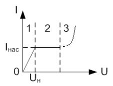 Дальнейший рост напряжения уже не вызывает роста тока, главную роль играет уход ионов на электроды. Величина Iнас определяется источником естественной ионизации.