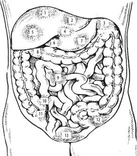 Рис. 7. Типичные места локализации абсцессов брюшной полости: 1 — правосторонний поддиафрагмальный абсцесс; 2 — срединный поддиафрагмальный абсцесс; 3 — левосторонний поддиафрагмальный абсцесс; 4 — абсцесс в сальниковой сумке; 5 — абсцесс печени; 6 — абсцесс в области культи двенадцатиперстной кишки; 7 — абсцесс в области культи желудка; 8 — подпеченочный абсцесс; 9 — межпетлевой абсцесс; 10–11 — абсцесс в области червеобразного отростка; 12 — абсцесс в области сигмовидной кишки; 13 — тазовый абсцесс.