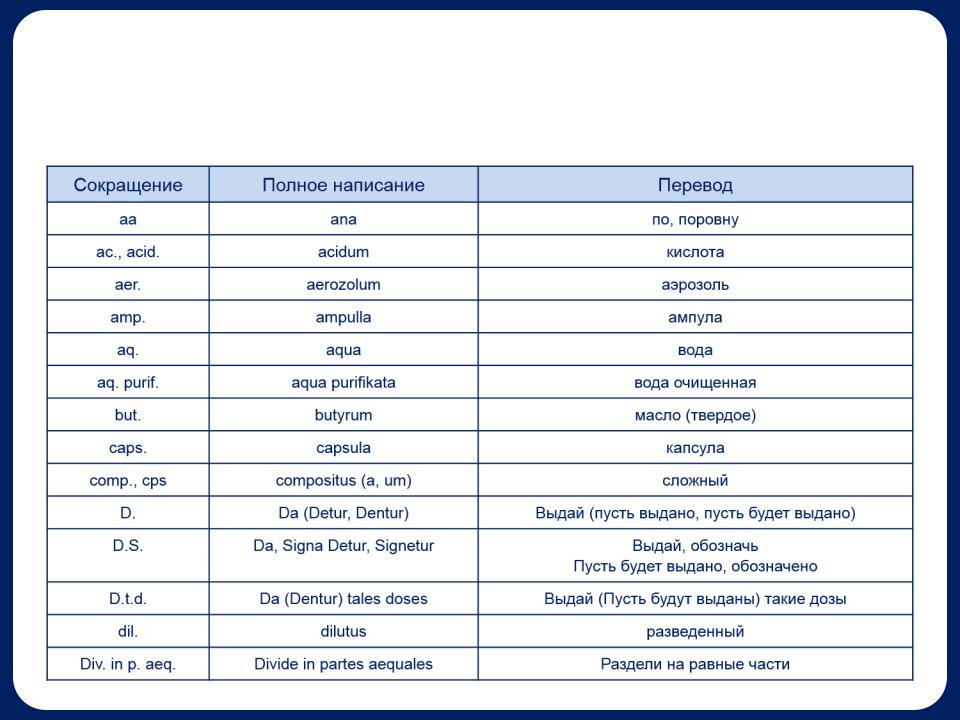 Рекомендованные к использованию сокращения при оформлении рецептов