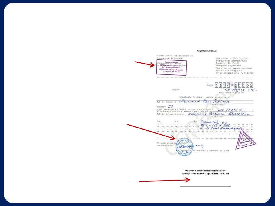 При оформлении рецептурных бланков на лекарственные препараты, назначенные по решению врачебной комиссии, на обороте рецептурного бланка ставится специальная отметка (штамп)