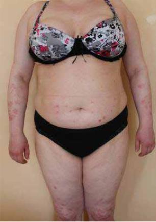 Рис. 1. Высыпания на туловище, верхних и нижних конечностях у больной псориазом