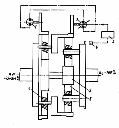 Тиристорные стабилизаторы имеют сложную электронную систему управления частотой и пока не получили широкого распространения на судах. Редукторы (для МОД - мультипликаторы) с постоянной частотой вращения выходного вала выполняют планетарного типа с гидравлическим или электрическим управлением частотой вращения солнечных шестерен. На рис. 5.1 показана кинематическая схема такого редуктора с гидравлическим управлением частотой вращения вала шестерен 5. Управляющее устройство 3 электронного типа получает сигнал от информационного датчика частоты вращения 4 и путем переключения клапанов в насосе 2 изменяет частоту вращения гидравлического двигателя 1, который через шестерни связан с эпициклом ведущего вала (6, 7 - сателлиты).