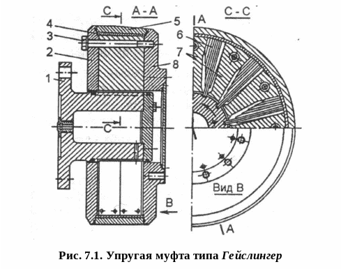 Из муфт с металлическими упругими элементами наиболее распространена упругодемпфирующая муфта типа Гейслингер. Демпфирующими элементами этой муфты являются пакеты плоских пружин 6, соединяющие ведущую и ведомую полумуфты (рис. 7.1). Пакеты пружин 6 на ведущей полумуфте установлены в продольных пазах, а в наружную обечайку 5 ведомой части вмонтированы посредством конического кольца 4 и разделительных клиновидных вставок 7, стянутых с торцов дисками 2, 8 и болтами 3.