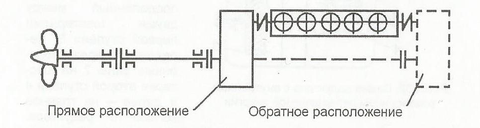 - второй тип компоновки, когда ведущая шестерня кормового двигателя располагается сверху, над колесом редуктора, а оси кормового двигателя и валопровода смещены в одну вертикальную плоскость (рис. 4.12).