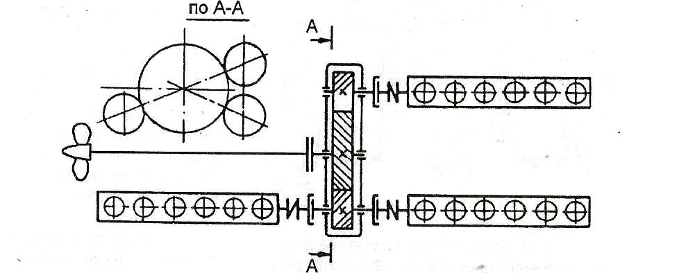 - первый тип компоновки, когда ось ведущей шестерни кормового двигателя располагается в одной продольной плоскости с осью одного из носовых двигателей (рис. 4.11);