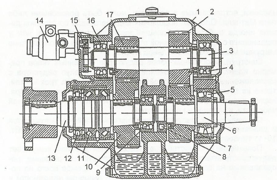 1 – корпус; 2, 7, 10, 17 – шестерни; 3, 6, 13 – ведущий, промежуточный