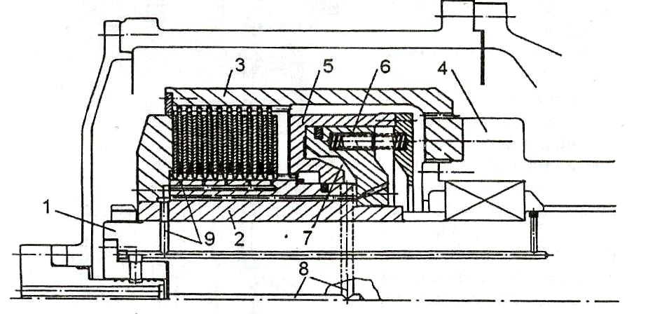 1 - торсионный вал; 2 - место установки ведущих дисков; 3 - место установки ведомых дисков; 4 - ведущая шестерня; 5 - цилиндр включения - выключения муфты; 6 - поршень включения муфты; 7 - полость для масла; 8 - канал подвода масла;