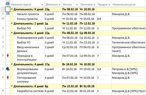 Начало и конец проекта обозначены работами с нулевой продолжительностью. Такие работы называются вехами и обозначают начало или конец наиболее важных этапов проекта.