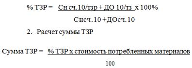 При втором способе аналитический учет материалов ведется на счете 10 по покупным ценам (цена указанная в с/ф поставщика без НДС). По дебету отражаются поступления материалов по покупной цене Д 10К 60, а по кредиту списание в производство, так же по покупной цене Д 20К 10. К счету 10 открывается отдельный субсчет, на котором учитываются ТЗР - 10/тзр. На этом субсчете собираются все расходы, связанные с погрузкой, разгрузкой этих материалов и их доставкой на склад предприятия Д 10/трз К 60,70,71... Фактическая себестоимость материалов складываются из суммы оборотов по дебету счета 10 и субсчета 10/тзр. Материалы отпускаются в цеха для изготовления продукции, что отражается проводкой Д 20,23,25,26 К 10. Одновременно рассчитывается сумма ТЗР, подлежащая списанию на счета затрат. Расчет осуществляется в два этапа: