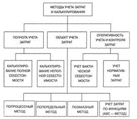 По объектам учета затрат выделяются попроцессный, попередельный, позаказный методы, а также метод учета (калькулирования) затрат по функциям. С точки зрения полноты учитываемых издержек возможно калькулирование полной и неполной ("усеченной") себестоимости. В зависимости от оперативности учета и контроля затрат различают метод учета фактических и нормативных затрат.