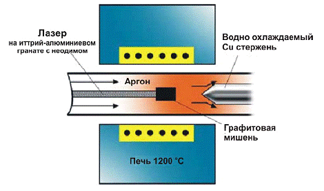 В установке используемой в работе (рисунок3.2.1) сканирующий лазерный луч фокусировался в 6-7 мм пятно на металл-графит содержащую мишень. Мишень помещалась в наполненную аргоном трубу при повышенном давлении и нагретой до 1200 °С. Сажа, которая образовывалась при лазерном испарении, уносилась потоком аргона из зоны высокой температуры и осаждалась на охлаждаемый водой медный коллектор, находящийся на выходе из трубы.