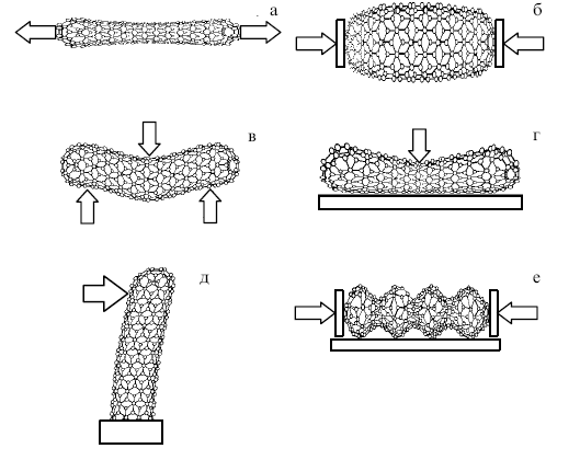 осевое растяжение; (б) осевое сжатие; (в) симметричный изгиб; (г) радиальное