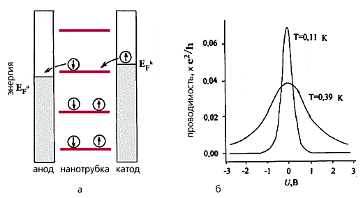 уровня в полевом транзисторе на металлической нанотрубке (а) и зависимость