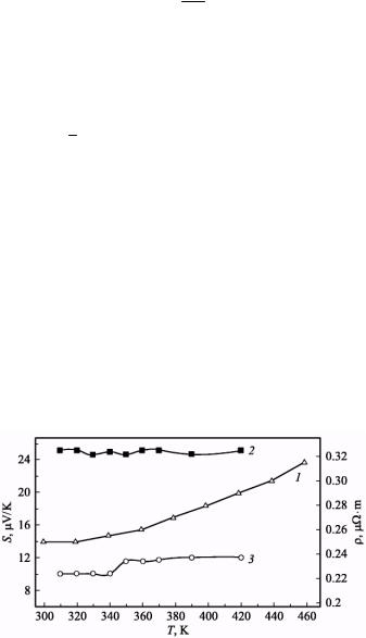 На рис. 5.11 представлена зависимость удельного электрического сопротивления ρ(Т) фрактальной структуры, полученной из углеродных нановолокон (кривая 1). Полученные значения ρ = 250µS × m в пять раз больше сопротивления графита ρ = 52µS × m. Измерения коэффициента Зеебека S проведены методом горячего зонда. На рис. 5.11 представлена зависимость S(T). Кривая 2 получена для поверхностных, а кривая 3 – для внутренних слоев фрактального клубка. Все значения S отрицательны. Представленные данные показывают, что более рыхлая поверхностная фрактальная структура имеет более высокие значения S = 24µV / K по сравнению с S = 11µV / K внутренних слоев фрактального клубка, что свидетельствует о возможности получения более высоких значений S в рыхлых фрактальных структурах.
