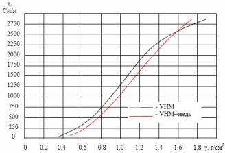 Вследствие того, что исследуемый материал представляет собой сыпучий порошок, определение его электропроводности в состоянии насыпной плотности является не корректным, так как в этом случае большой вклад в электропроводность вносит контактное сопротивление между фрагментами УНМ. Поэтому целесообразно было исследовать зависимость электропроводности УНМ χ от плотности компактирования . Для этого было разработано и изготовлено специальное измерительное устройство.