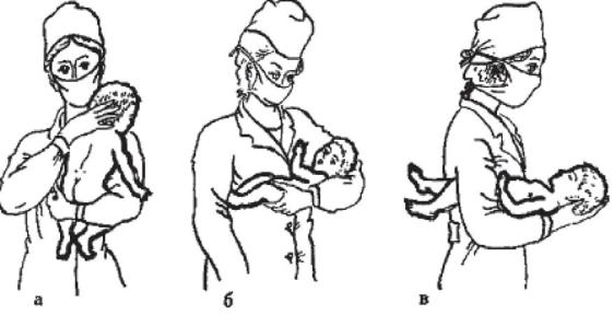 Транспортировка детей грудного возраста обычно не представляет трудностей. Детей обычно переносят на руках (рисунок 4а). Необходимо использовать наиболее физиологическое и удобное поло-