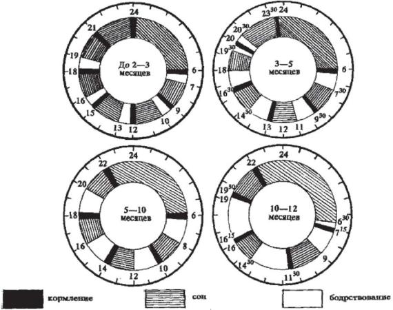 Дети первого года жизни особенно нуждаются в тщательном соблюдении режима дня. Наиболее важно следить за временем бодрствования, сна, частотой и временем кормления больного ребенка. Основные элементы режима дня детей различного возраста представлены на рисунке 8.
