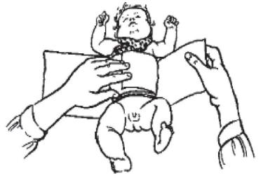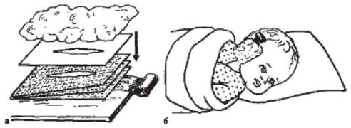 Холодный компресс. Холодный компресс назначают при повышенной температуре тела, чаще детям раннего возраста. Холодный компресс прикладывают следующим образом: поперек кроватки стелют махровое полотенце или одеяльце, затем сложенную пополам пеленку, предварительно намоченную в холодной воде и выжатую. Голого ребенка кладут спиной на мокрую пеленку и, подняв его руки, обворачивают свободные концы пеленки вокруг груди. Вторую, также намоченную в холодной воде и выжатую пеленку прикладывают на груди ребенка (рисунок 39).
