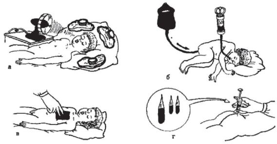 Рисунок 40 - Помощь при гипертермии, а - обкладывание головы пузырями со льдом; б - промывание желудка и введение прохладной воды в прямую кишку, в - обтирание кожи спиртовым раствором или эфиром; г - введение лекарственных средств