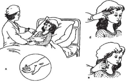 Рисунок 41 - Определение пульса: а - на лучевой артерии; б - на височной артерии; в - на сонной артерии