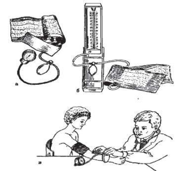 Рисунок 42 - Измерение артериального давления: а - тонометр; б - ртутный сфигмоманометр; в - правильное наложение манжетки