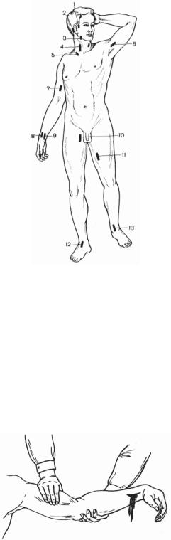 Симптомы кровотечения. В зависимости от вида поврежденных кровеносных сосудов кровотечение может быть артериальным, венозным, капиллярным, паренхиматозным, смешанным. Для артериального кровотечения характерно выделение крови из раны пульсирующей струей. Раны могут локализоваться в области расположения крупных сосудов (рисунок 43). При венозном кровотечении кровь более темная и обильно выделяется из раны непрерывной струей без тенденции к самостоятельной остановке. В ране можно видеть пересеченную вену. Капиллярное кровотечение наблюдается при кожно-мышечных ранениях.
