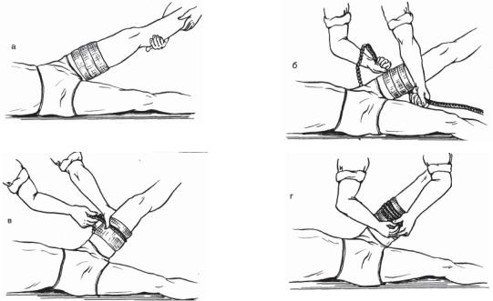 Рисунок 48 - Наложение стандартного резинового жгута: а - обертывание конечности полотенцем; б - жгут подведен под бедро и растянут; в - первый оборот жгута; г - закрепление жгута